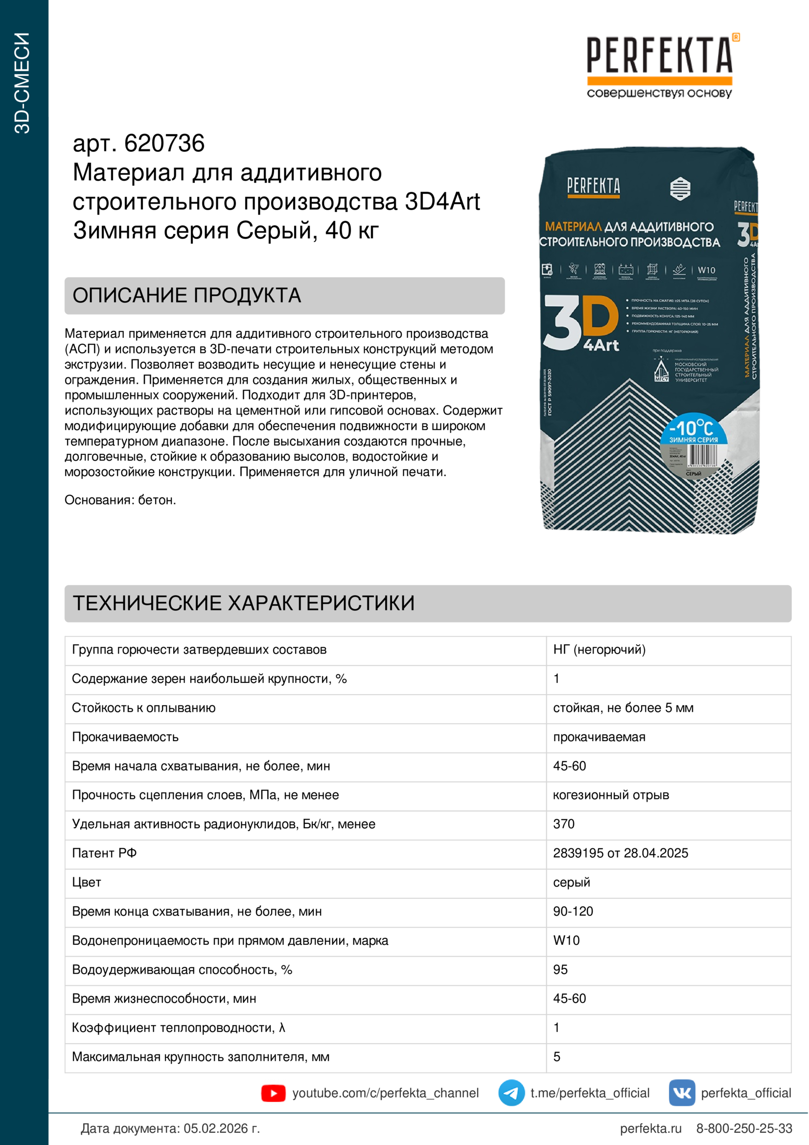 Материал применяется для аддитивного строительного производства (АСП) и используется в 3D-печати строительных конструкций методом экструзии. Позволяет возводить несущие и ненесущие стены и ограждения. Применяется для создания жилых, общественных и промышленных сооружений. Подходит для 3D-принтеров, использующих растворы на цементной или гипсовой основах. Содержит модифицирующие добавки для обеспечения подвижности в широком температурном диапазоне. После высыхания создаются прочные, долговечные, стойкие к образованию высолов, водостойкие и морозостойкие конструкции. Применяется для уличной печати.