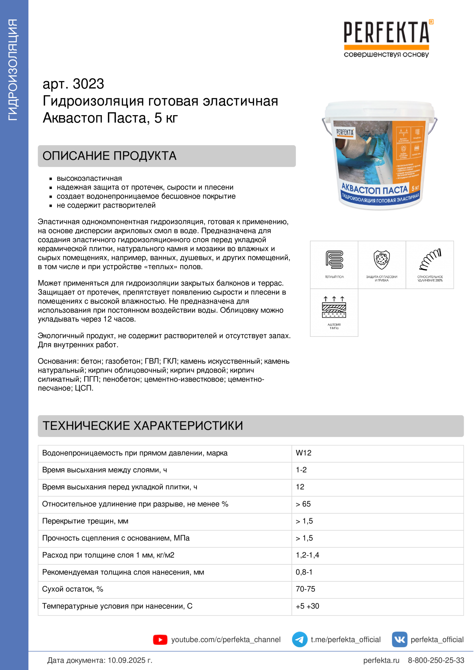 Все рекомендации и технические характеристики верны при температуре окружающей среды +20°С и относительной влажности 60%. Качество материала гарантируется только при точном соблюдении инструкции производителя по технологии применения и требований СНиП и СП. Данная инструкция теряет силу после появления новой версии на сайте perfekta.ru