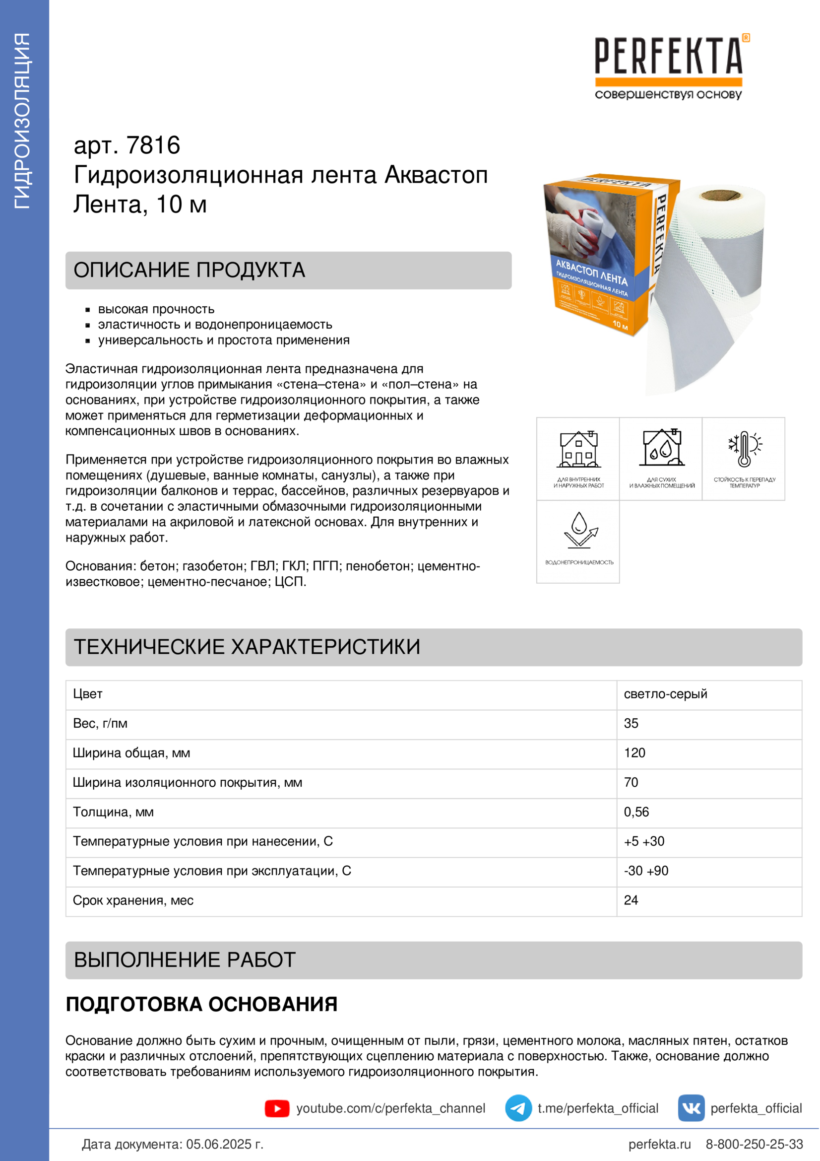 Эластичная гидроизоляционная лента предназначена для гидроизоляции углов примыкания «стена–стена» и «пол–стена» на основаниях, при устройстве гидроизоляционного покрытия, а также может применяться для герметизации деформационных и компенсационных швов в основаниях.