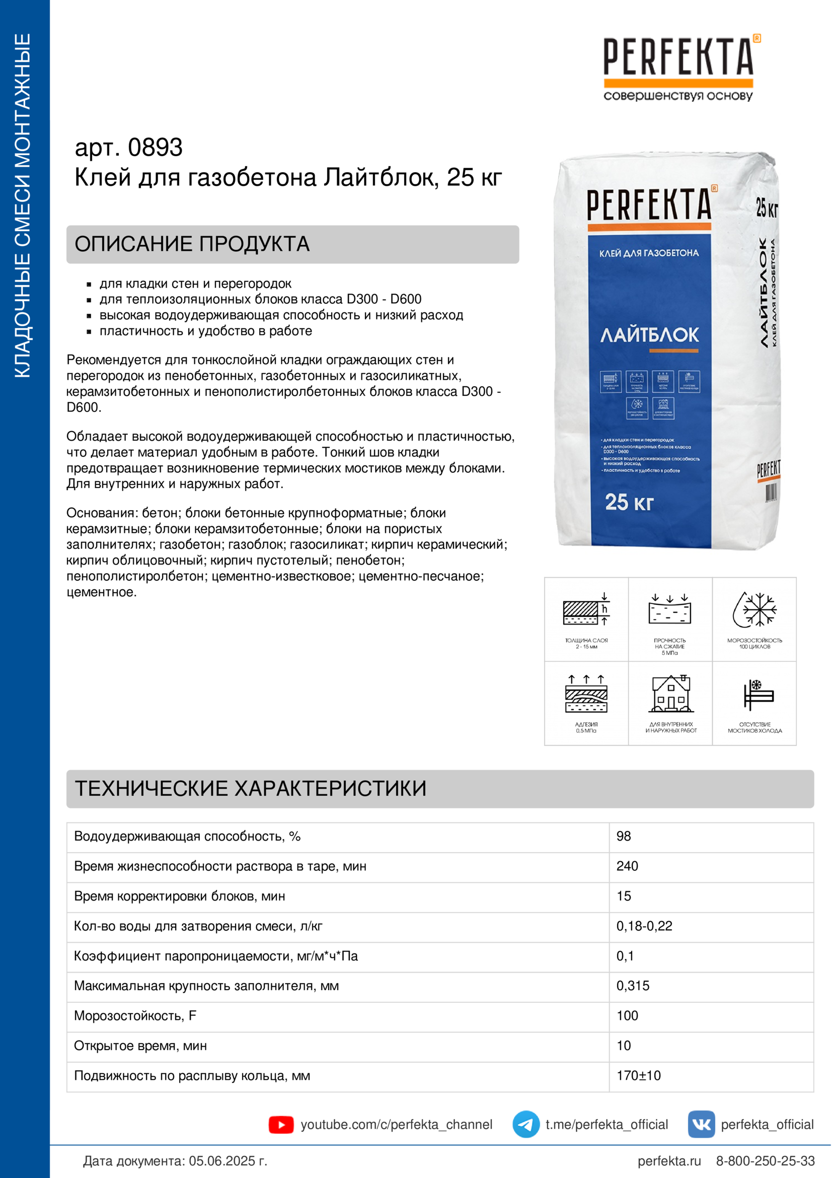 Рекомендуется для тонкослойной кладки ограждающих стен и перегородок из пенобетонных, газобетонных и газосиликатных, керамзитобетонных и пенополистиролбетонных блоков класса D300 - D600.