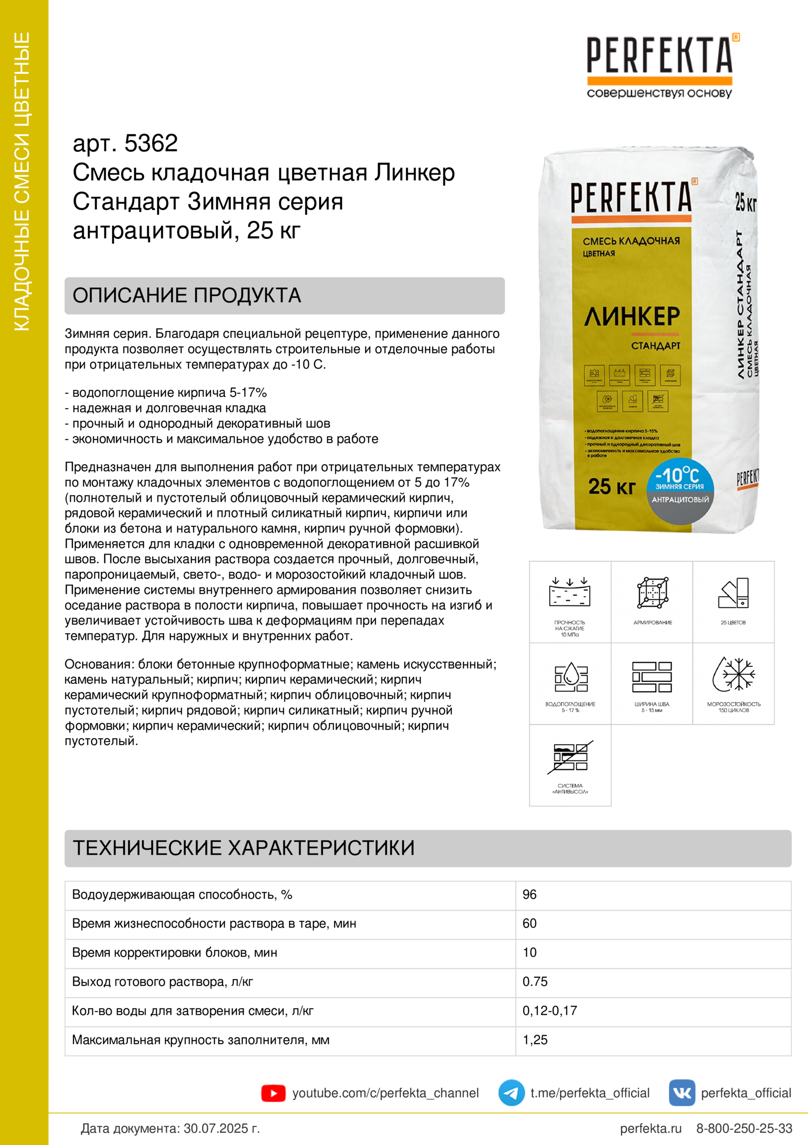 Предназначен для выполнения работ при отрицательных температурах по монтажу кладочных элементов с водопоглощением от 5 до 17% (полнотелый и пустотелый облицовочный керамический кирпич, рядовой керамический и плотный силикатный кирпич, кирпичи или блоки из бетона и натурального камня, кирпич ручной формовки).