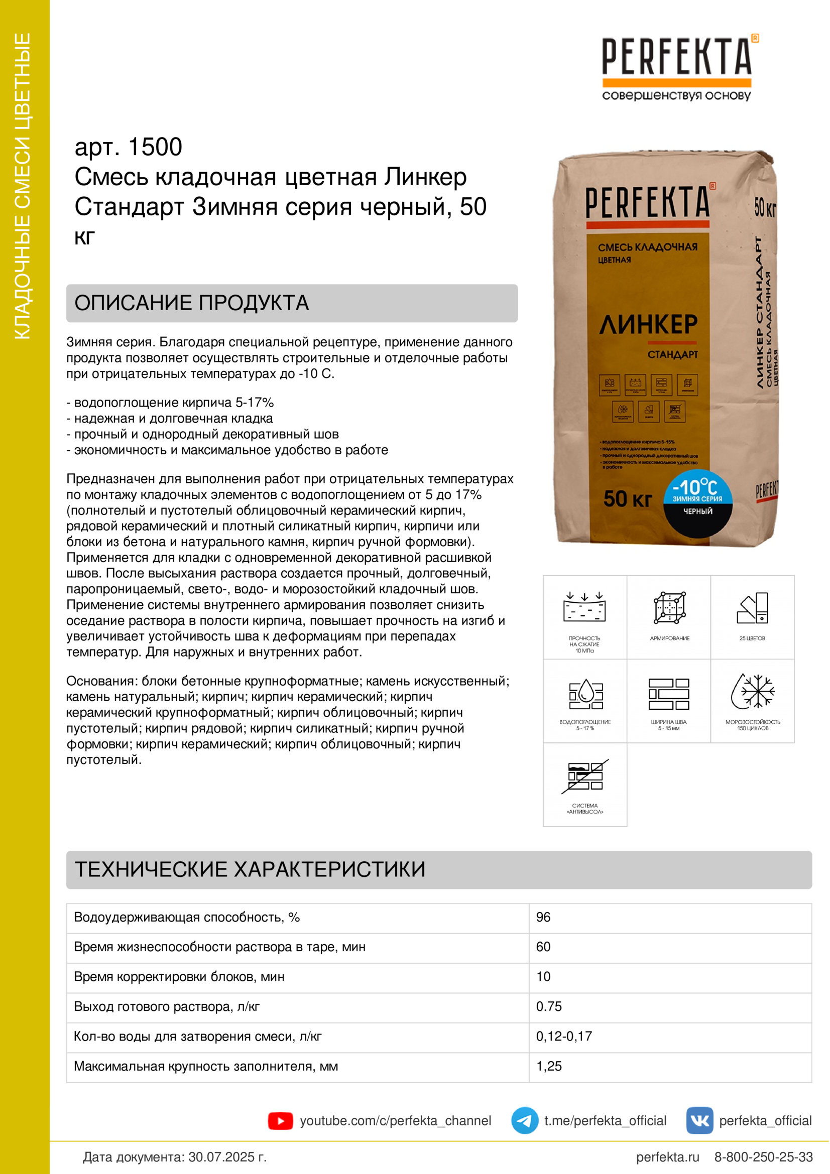 Предназначен для выполнения работ при отрицательных температурах по монтажу кладочных элементов с водопоглощением от 5 до 17% (полнотелый и пустотелый облицовочный керамический кирпич, рядовой керамический и плотный силикатный кирпич, кирпичи или блоки из бетона и натурального камня, кирпич ручной формовки).