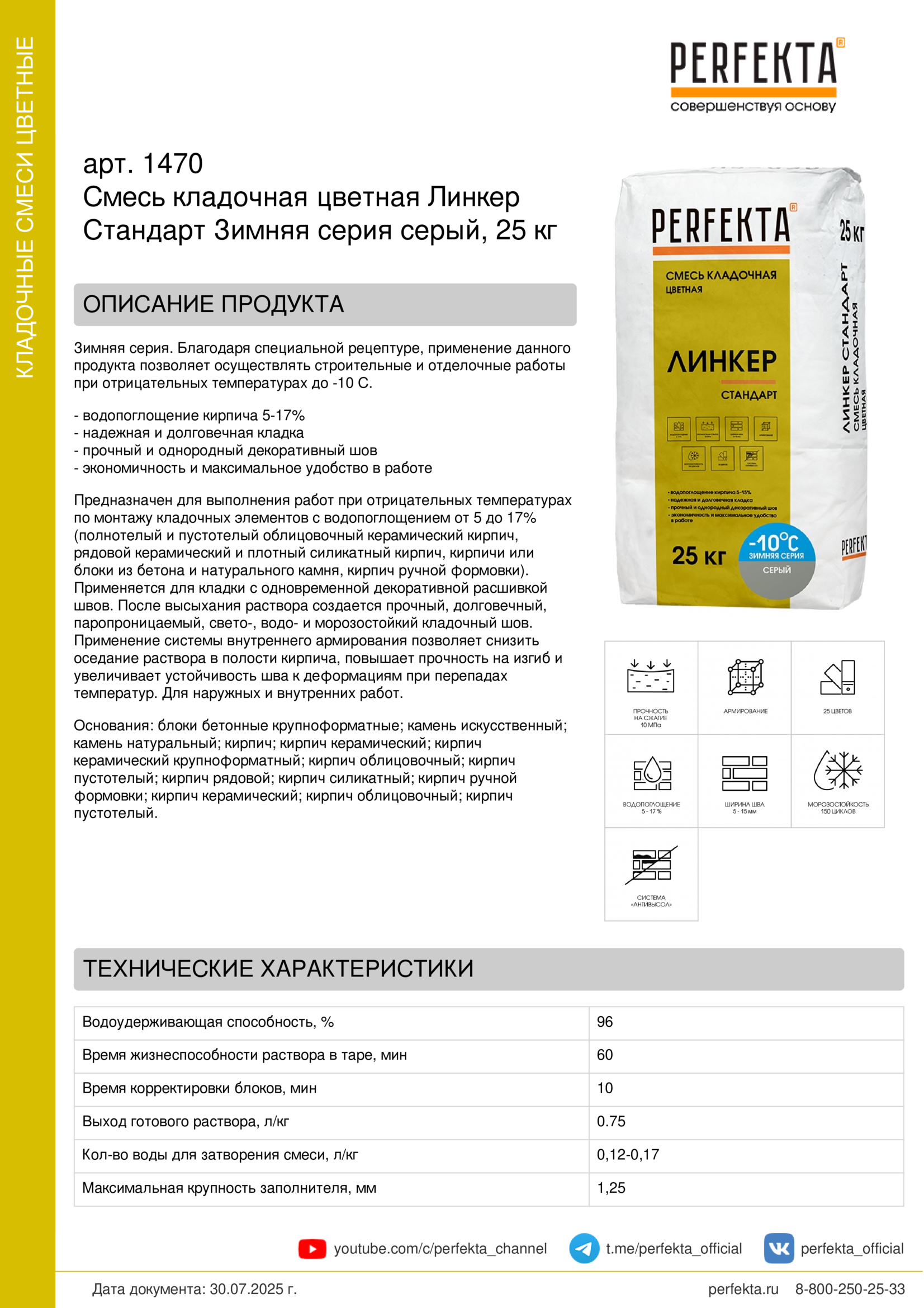 Предназначен для выполнения работ при отрицательных температурах по монтажу кладочных элементов с водопоглощением от 5 до 17% (полнотелый и пустотелый облицовочный керамический кирпич, рядовой керамический и плотный силикатный кирпич, кирпичи или блоки из бетона и натурального камня, кирпич ручной формовки).