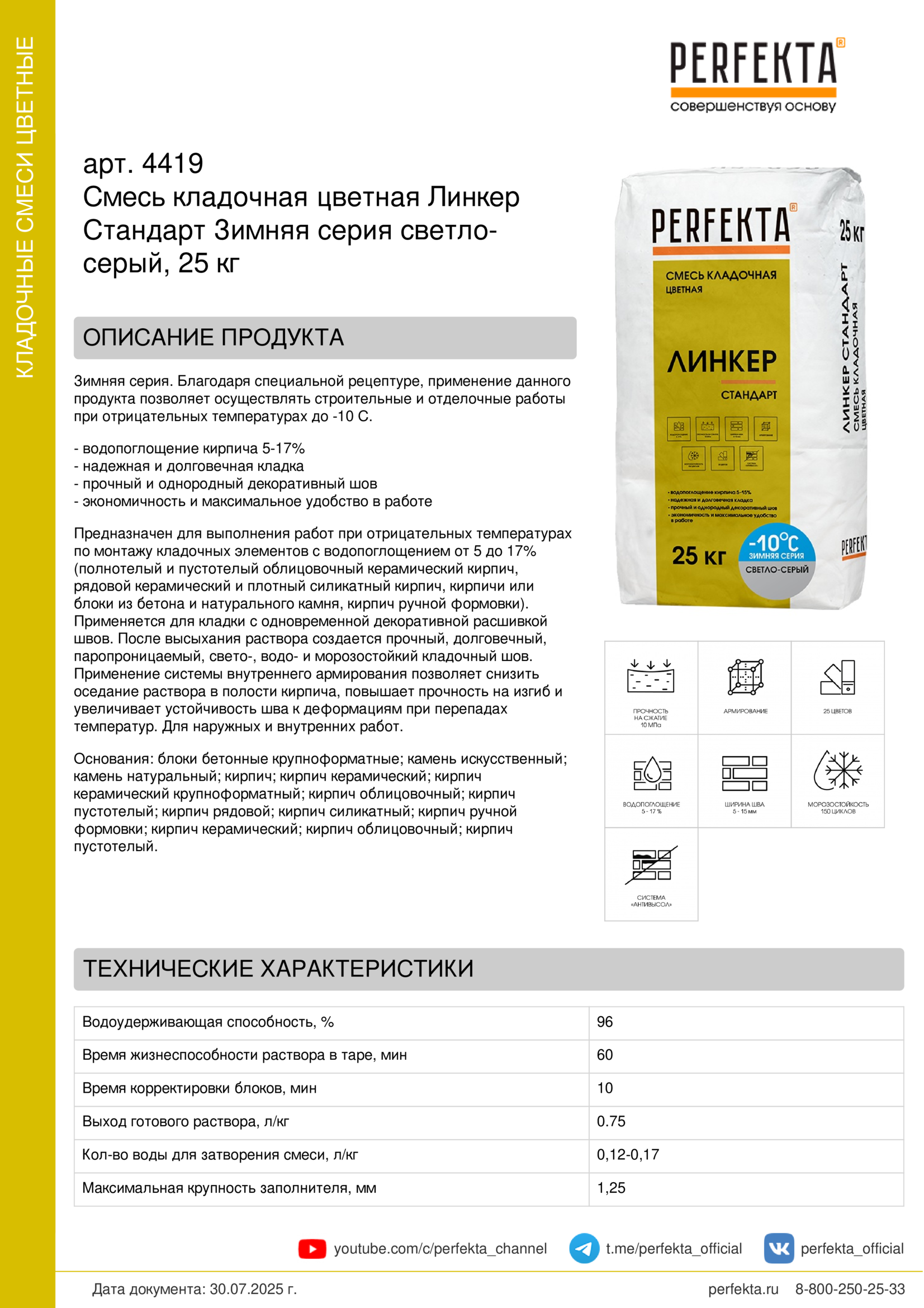 Зимняя серия. Благодаря специальной рецептуре, применение данного продукта позволяет осуществлять строительные и отделочные работы при отрицательных температурах до -10 С.