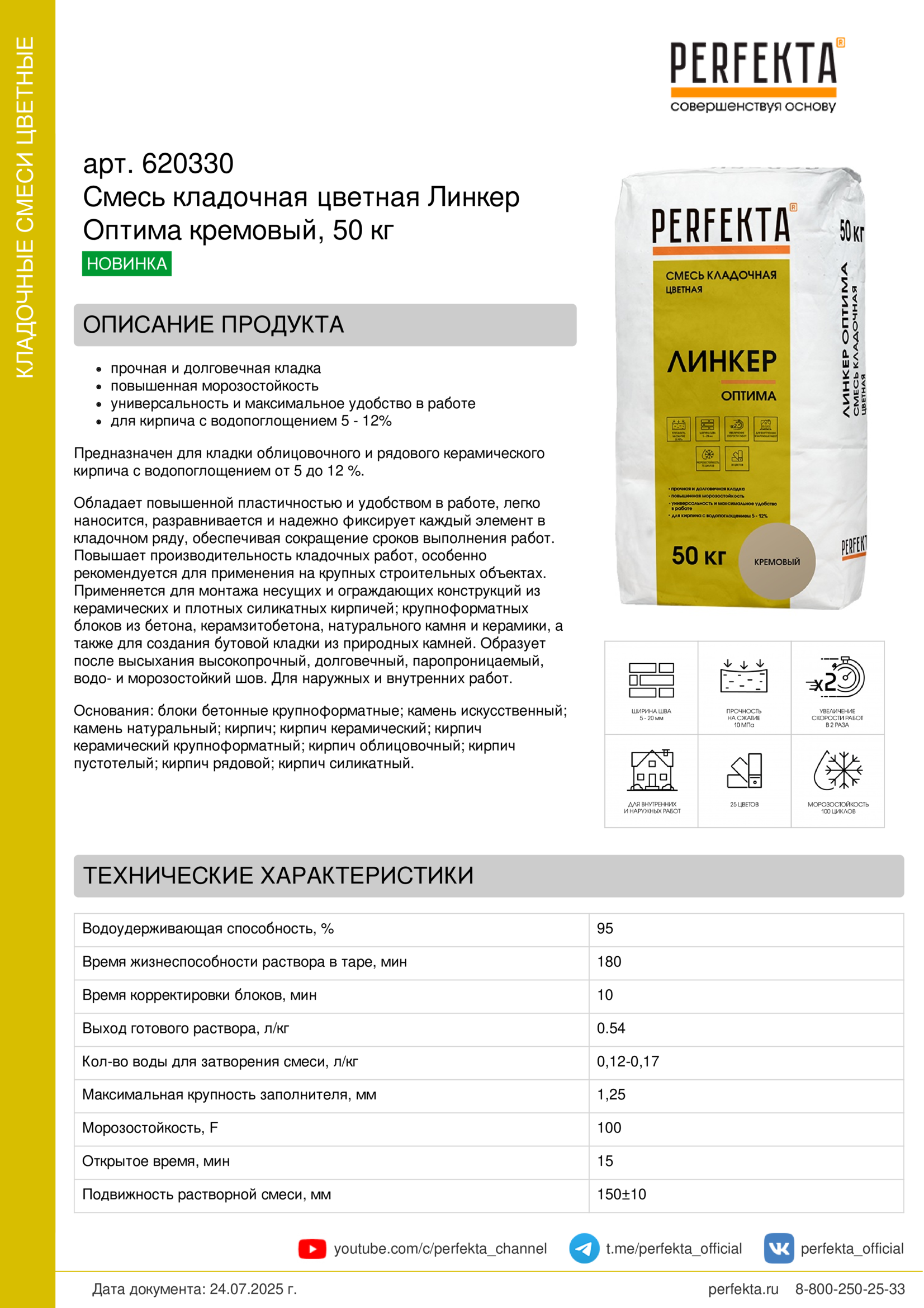 Предназначен для кладки облицовочного и рядового керамического кирпича с водопоглощением от 5 до 12 %.