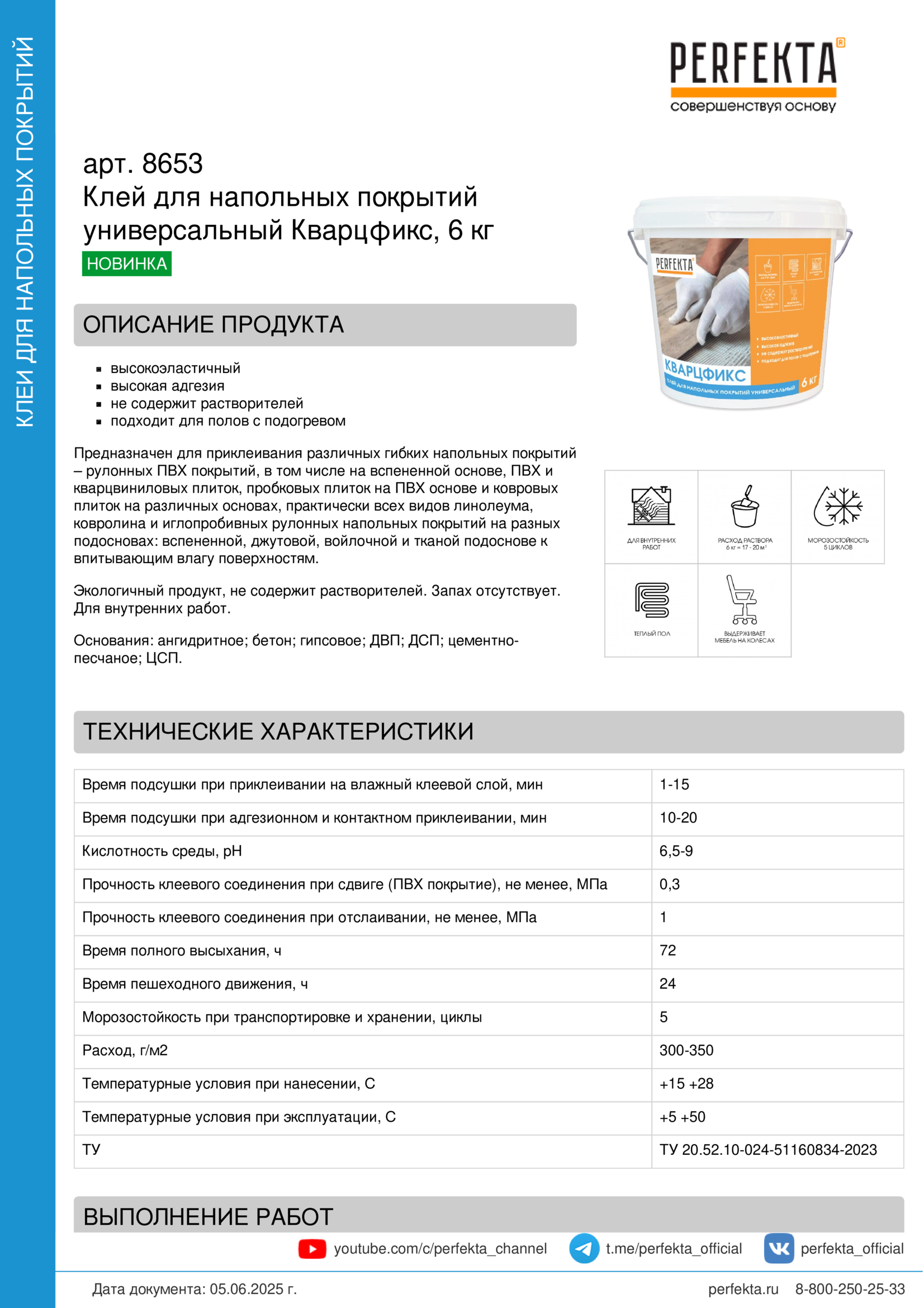 Предназначен для приклеивания различных гибких напольных покрытий – рулонных ПВХ покрытий, в том числе на вспененной основе, ПВХ и кварцвиниловых плиток, пробковых плиток на ПВХ основе и ковровых плиток на различных основах, практически всех видов линолеума, ковролина и иглопробивных рулонных напольных покрытий на разных подосновах: вспененной, джутовой, войлочной и тканой подоснове к впитывающим влагу поверхностям.