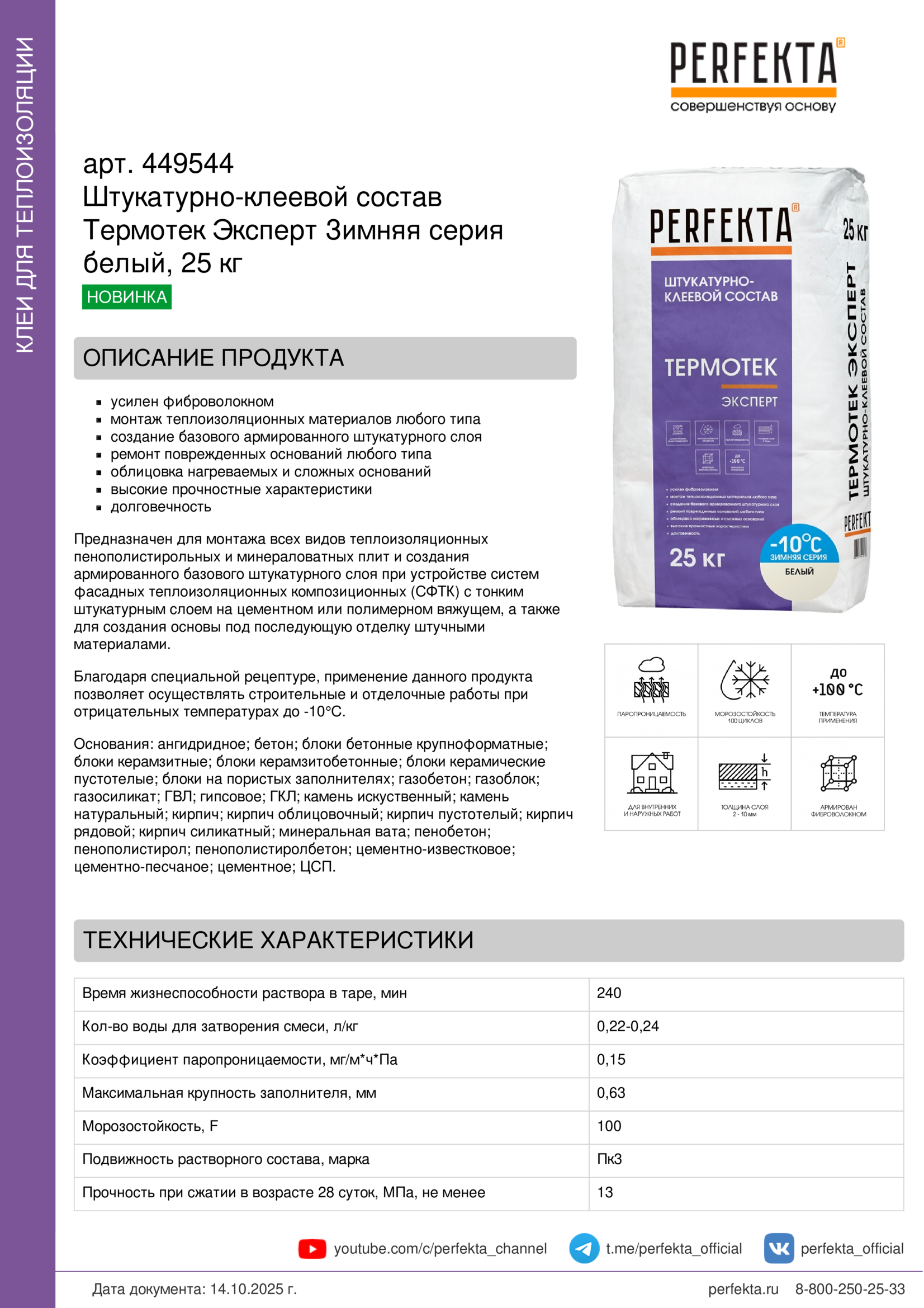 Все рекомендации и технические характеристики верны при температуре окружающей среды +20°С и относительной влажности 60 %. Качество материала гарантируется только при точном соблюдении инструкции производителя по технологии применения и требований СП 293.1325800.2017. Данная инструкция теряет силу после появления новой версии на сайте perfekta.ru.
