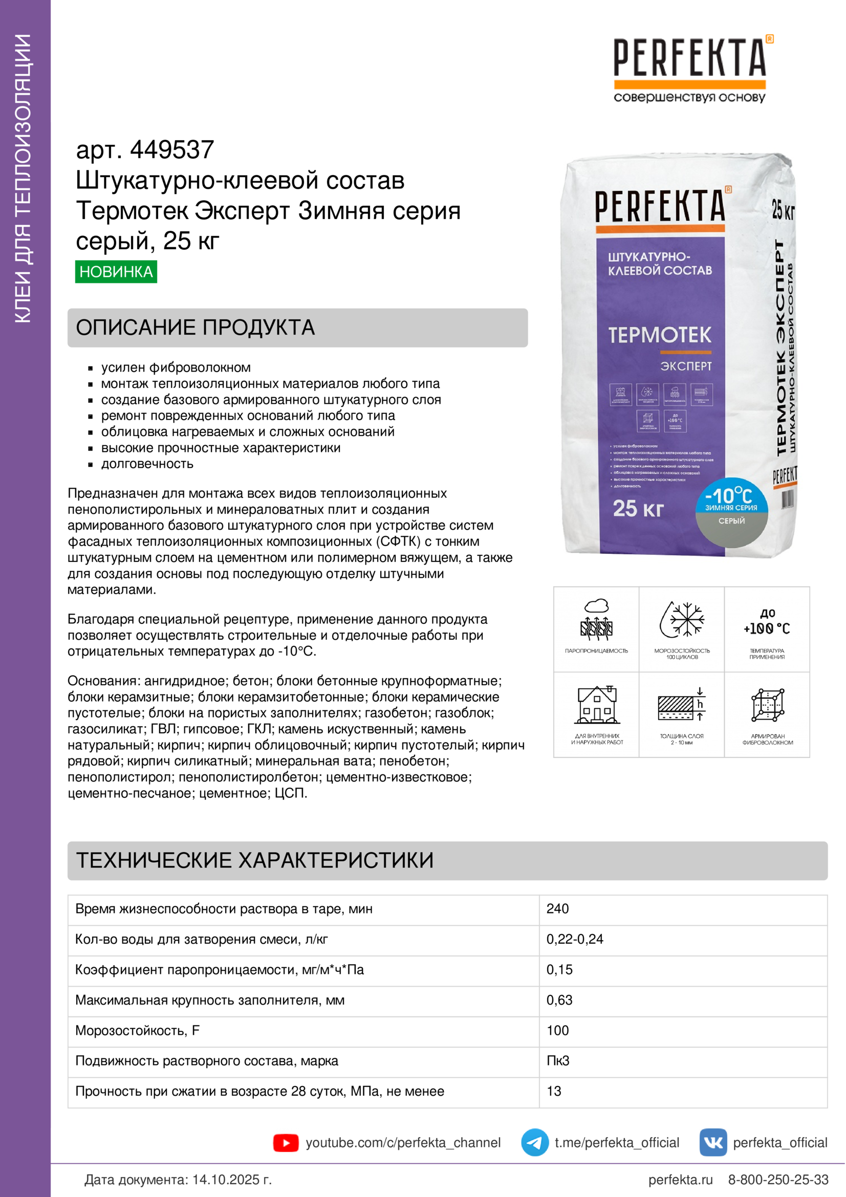 Все рекомендации и технические характеристики верны при температуре окружающей среды +20°С и относительной влажности 60 %. Качество материала гарантируется только при точном соблюдении инструкции производителя по технологии применения и требований СП 293.1325800.2017. Данная инструкция теряет силу после появления новой версии на сайте perfekta.ru.