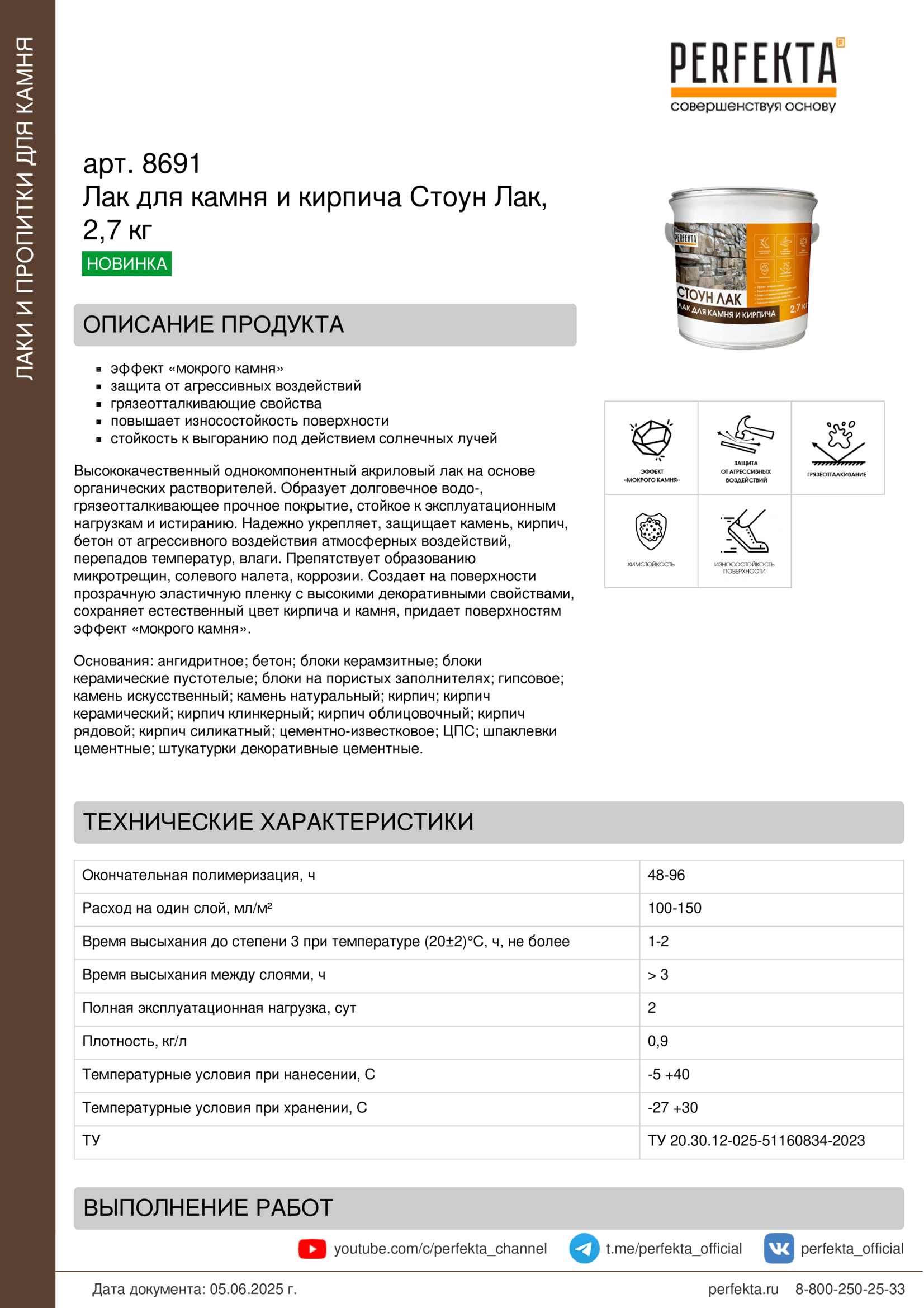 Высококачественный однокомпонентный акриловый лак на основе органических растворителей. Образует долговечное водо-, грязеотталкивающее прочное покрытие, стойкое к эксплуатационным нагрузкам и истиранию. Надежно укрепляет, защищает камень, кирпич, бетон от агрессивного воздействия атмосферных воздействий, перепадов температур, влаги. Препятствует образованию микротрещин, солевого налета, коррозии. Создает на поверхности прозрачную эластичную пленку с высокими декоративными свойствами, сохраняет естественный цвет кирпича и камня, придает поверхностям эффект «мокрого камня».