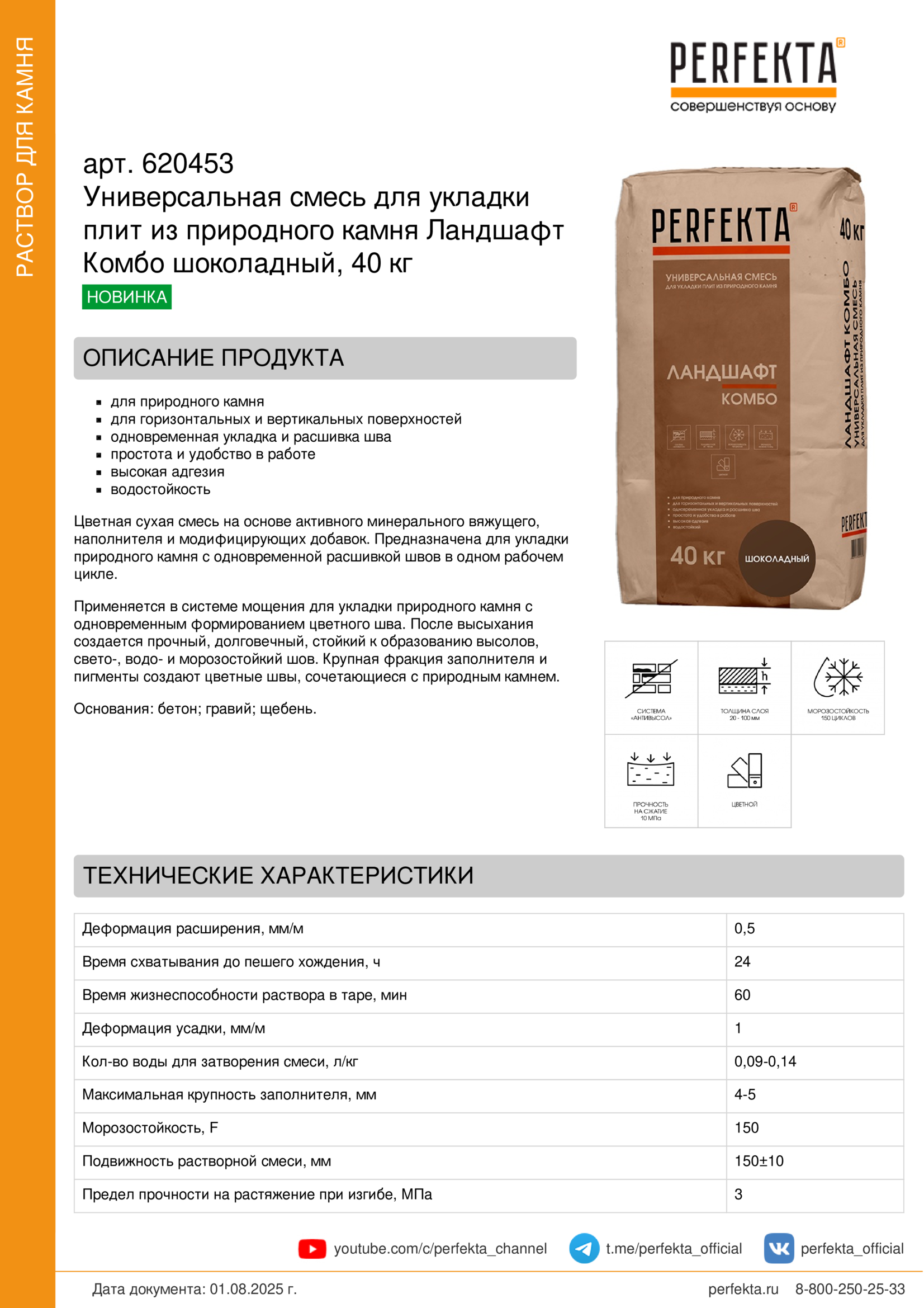 Цветная сухая смесь на основе активного минерального вяжущего, наполнителя и модифицирующих добавок. Предназначена для укладки природного камня с одновременной расшивкой швов в одном рабочем цикле.