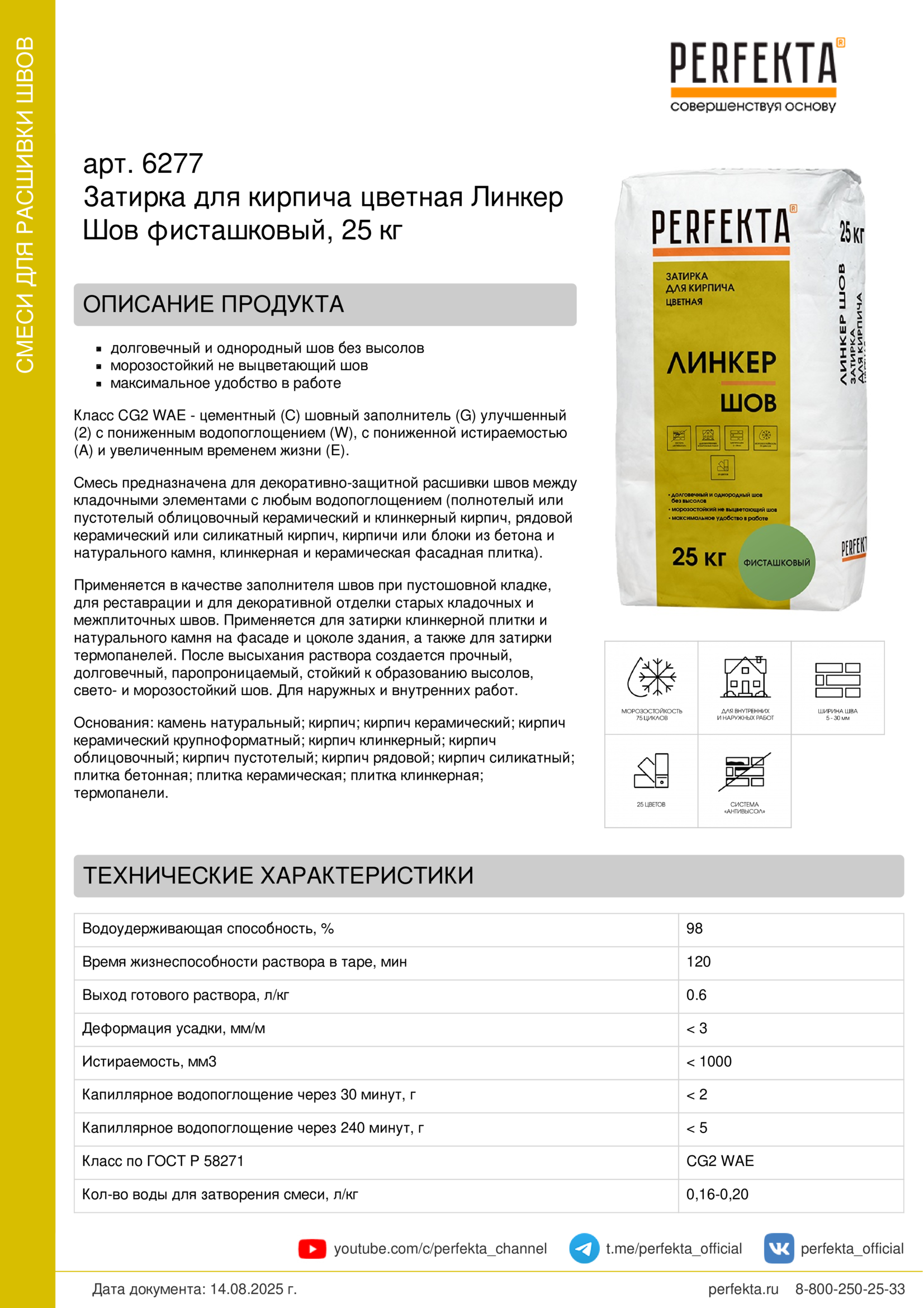 Полусухое применение: Уложить небольшое количество приготовленного раствора на поверхность расшивочного подноса и приложить край подноса к шву. Затем с помощью узкого шпателя нанести раствор в два приема, по методу «свежее по свежему» и распределить в него раствор равномерным слоем по поверхности. Декоративная расшивка шва при этом возможна одновременно с нанесением раствора. Свежеуложенные швы необходимо защищать от воздействия повышенных температур, осадков, сквозняков, попадания прямых солнечных лучей и мороза. После полного высыхания раствора в шве, обычно через 24 часа, необходимо удалить остатки материала из шва и лицевой поверхности кирпича, при помощи сухой мягкой щетки или кисти. Для получения идеального результата рекомендуется дополнительная защита шва при помощи гидрофобизатора для кирпича и бетона PERFEKTA Линкер Аквабарьер. Работы допускается производить при температуре воздуха и кладочных элементов не ниже +5°С и не выше +30°С. Свежеуложенную кладку и швы необходимо защищать от воздействия повышенных температур, осадков, сквозняков, попадания прямых солнечных лучей и мороза в течение 5-7 дней. Защиту следует производить с помощью накрывания пленкой, но при этом обеспечивать проветривание во избежание образования конденсата под пленкой. Примечание: Оттенок шва затвердевшего материала может изменяться в зависимости от погодных условий, от способа применения на строительном объекте, а также от способа формирования шва. Для точного выбора цвета раствора, рекомендуется предварительное выполнение пробной кладки.