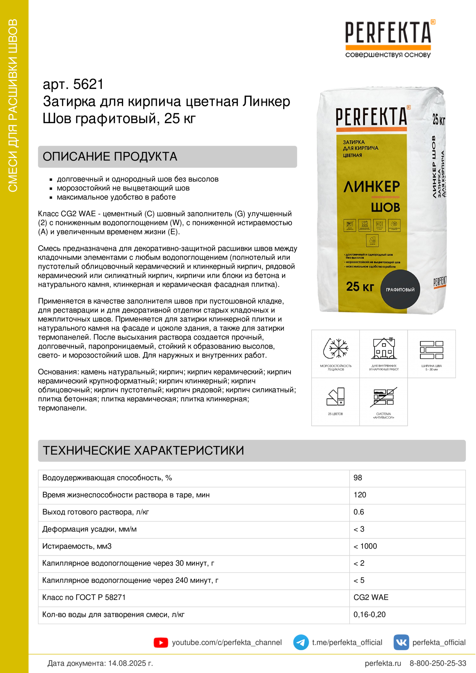 Полусухое применение: Уложить небольшое количество приготовленного раствора на поверхность расшивочного подноса и приложить край подноса к шву. Затем с помощью узкого шпателя нанести раствор в два приема, по методу «свежее по свежему» и распределить в него раствор равномерным слоем по поверхности. Декоративная расшивка шва при этом возможна одновременно с нанесением раствора. Свежеуложенные швы необходимо защищать от воздействия повышенных температур, осадков, сквозняков, попадания прямых солнечных лучей и мороза. После полного высыхания раствора в шве, обычно через 24 часа, необходимо удалить остатки материала из шва и лицевой поверхности кирпича, при помощи сухой мягкой щетки или кисти. Для получения идеального результата рекомендуется дополнительная защита шва при помощи гидрофобизатора для кирпича и бетона PERFEKTA Линкер Аквабарьер. Работы допускается производить при температуре воздуха и кладочных элементов не ниже +5°С и не выше +30°С. Свежеуложенную кладку и швы необходимо защищать от воздействия повышенных температур, осадков, сквозняков, попадания прямых солнечных лучей и мороза в течение 5-7 дней. Защиту следует производить с помощью накрывания пленкой, но при этом обеспечивать проветривание во избежание образования конденсата под пленкой. Примечание: Оттенок шва затвердевшего материала может изменяться в зависимости от погодных условий, от способа применения на строительном объекте, а также от способа формирования шва. Для точного выбора цвета раствора, рекомендуется предварительное выполнение пробной кладки.
