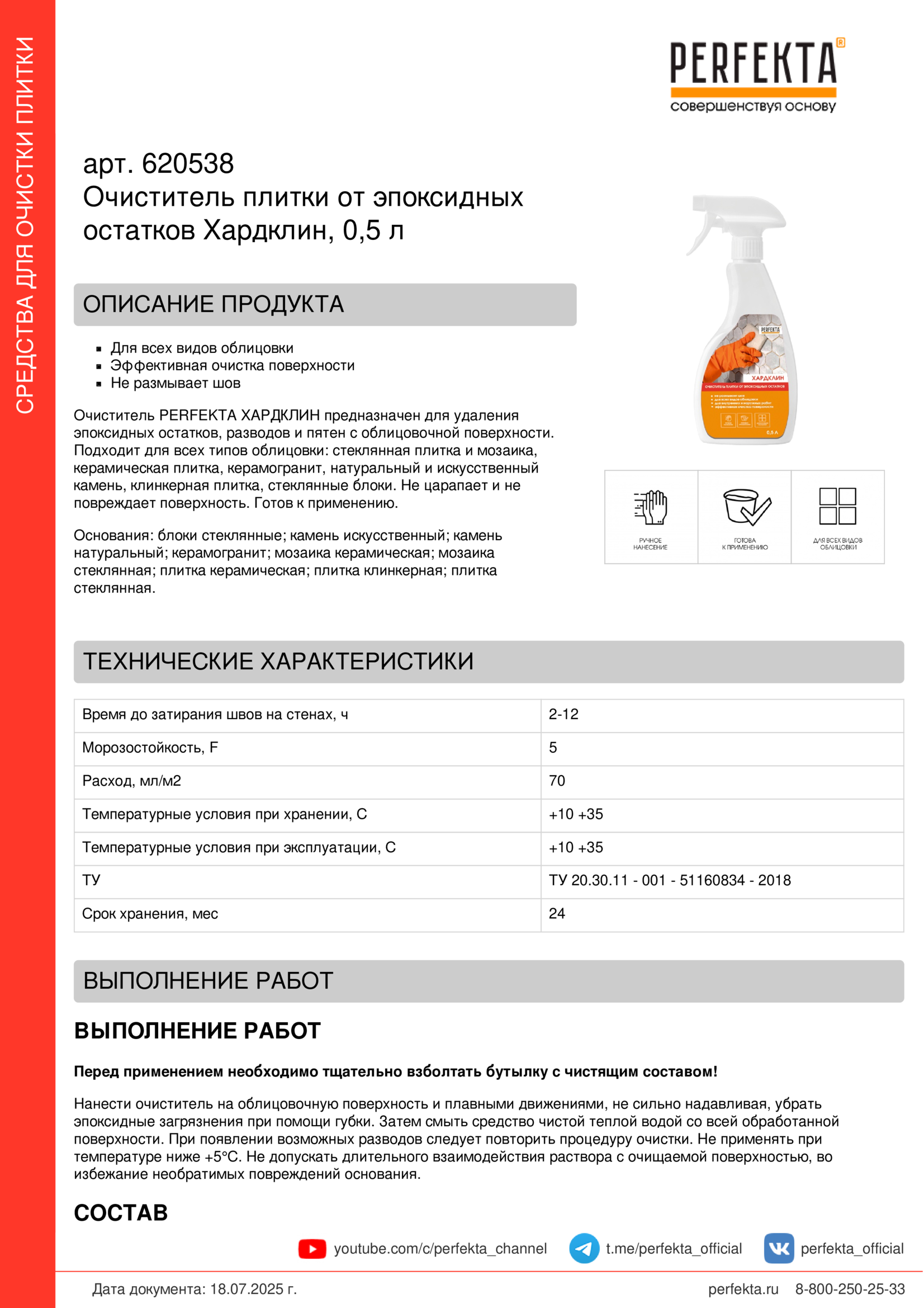 Очиститель PERFEKTA ХАРДКЛИН предназначен для удаления эпоксидных остатков, разводов и пятен с облицовочной поверхности. Подходит для всех типов облицовки: стеклянная плитка и мозаика, керамическая плитка, керамогранит, натуральный и искусственный камень, клинкерная плитка, стеклянные блоки. Не царапает и не повреждает поверхность. Готов к применению.