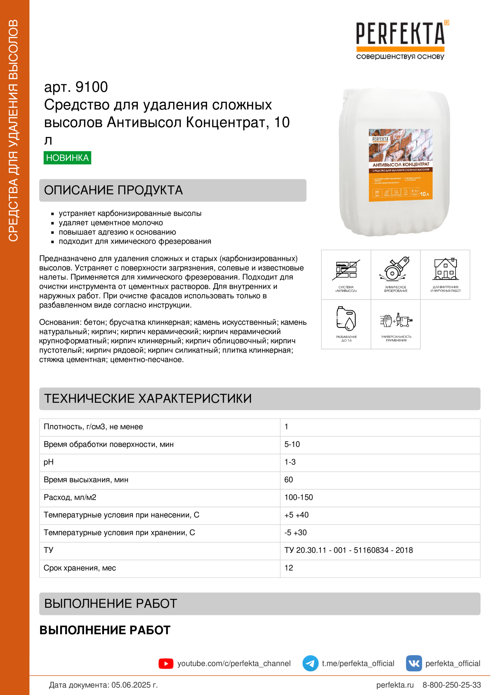 Предназначено для удаления сложных и старых (карбонизированных) высолов. Устраняет с поверхности загрязнения, солевые и известковые налеты. Применяется для химического фрезерования. Подходит для очистки инструмента от цементных растворов. Для внутренних и наружных работ. При очистке фасадов использовать только в разбавленном виде согласно инструкции.