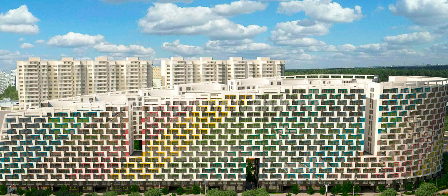 Вытянутый многосекционный корпус имеет эллиптическую форму и выступает в роли своеобразной «орбиты». Каждая секция новостройки названа в честь планеты Солнечной системы или ее спутника. Уличная сторона фасадов окрашена в радужные цвета, внутренний двор по стилистике более минималистичный.